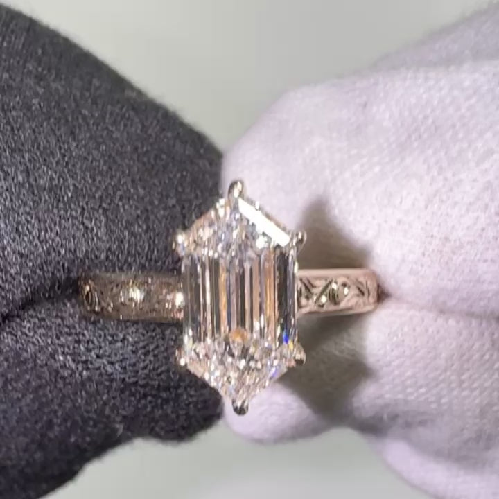 This ring features a 2.5CT Dutch marquise center stone, set in a 14K yellow gold 3mm band with claw prongs. Custom hand engraving details the top of the band, the gallery rail, and the bridge.